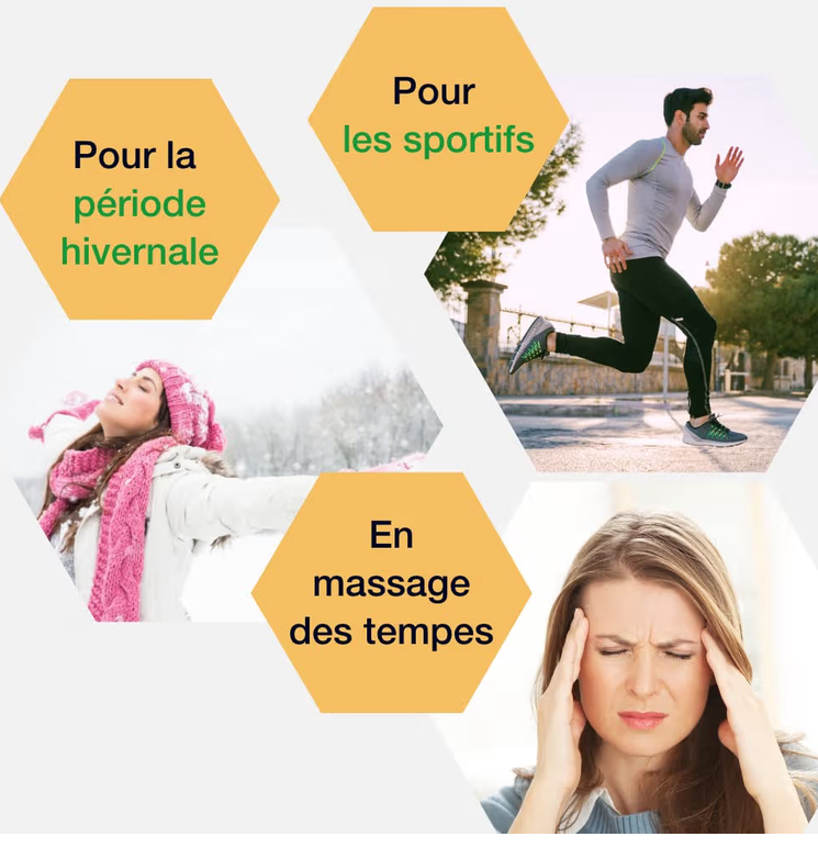 - Appliquer une petite quantité sur la zone ciblée (muscle, articulation, poitrine, tempes).